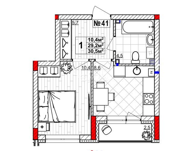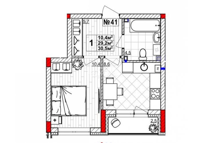 Площадь: 30.5/10.5/8.6 м²