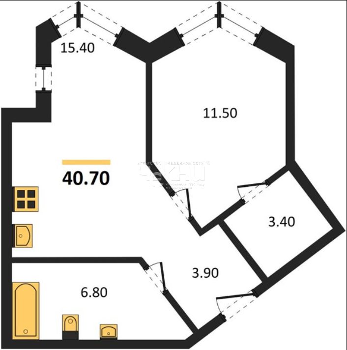 Площадь: 34.37/11.45/13.66 м²
