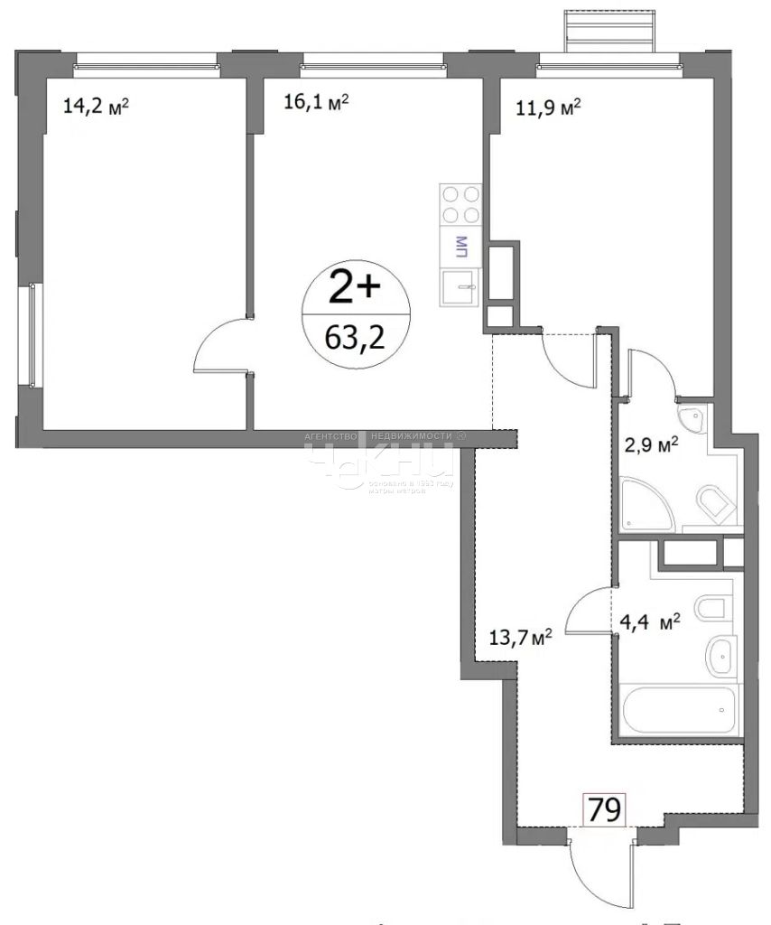 Площадь: 63.4/26.3/16.1 м²