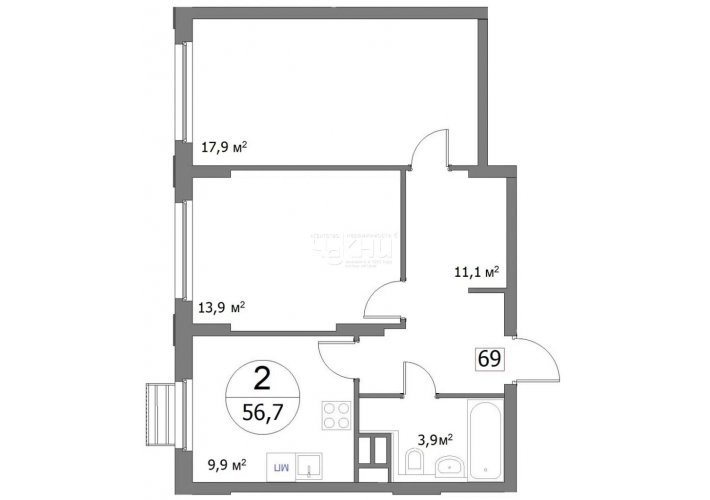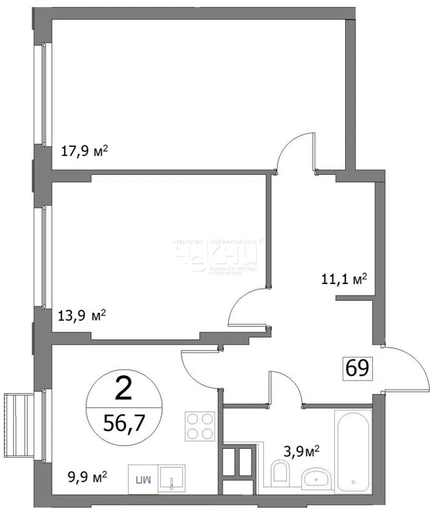Площадь: 56.6/31.7/9.9 м²