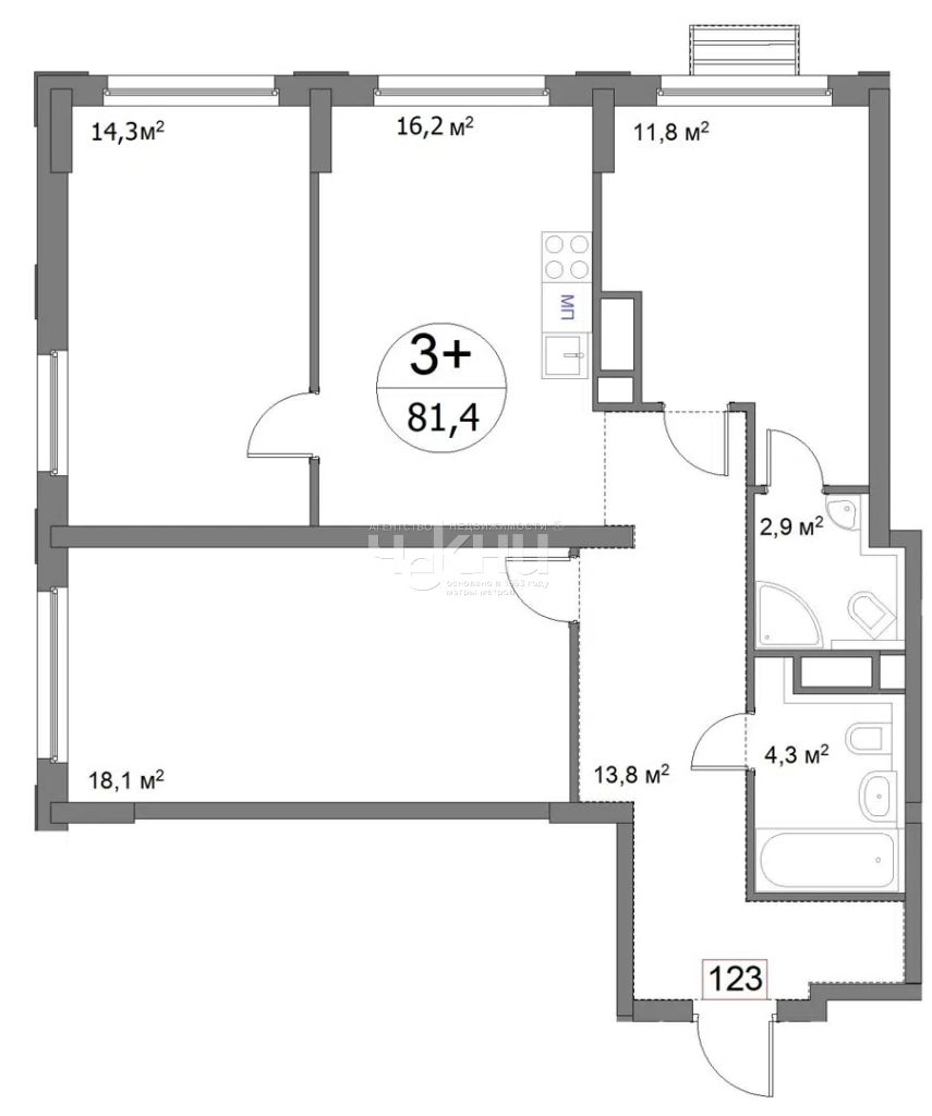 Площадь: 81.3/44.2/16.1 м²