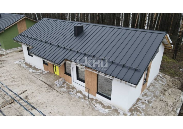 Кровля: Надежная и стильная Кликфальц PRO DRAP, утепленная 200 мм, с системой снегозадержателей, вентиляционными колпаками, металлическими карнизами 900 мм в цвете Drap и квадратной водосточной системой Grand Line.
