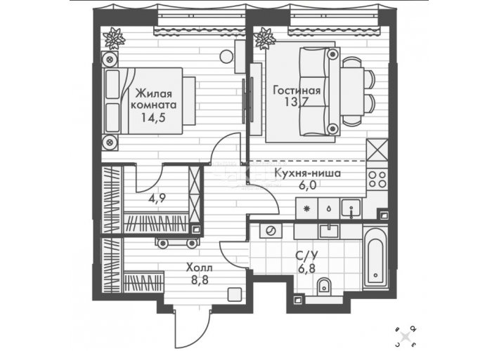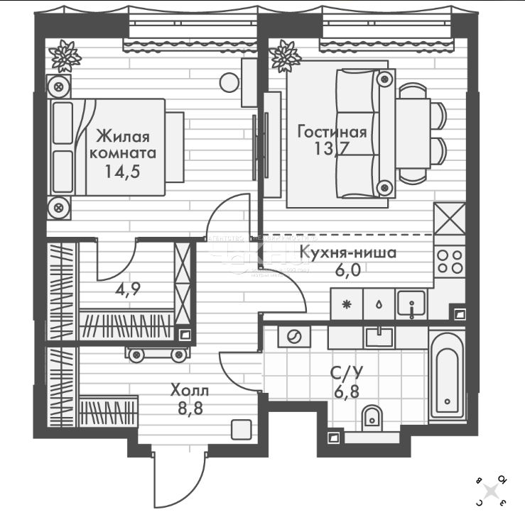 Площадь: 49.6/26.9/6 м²