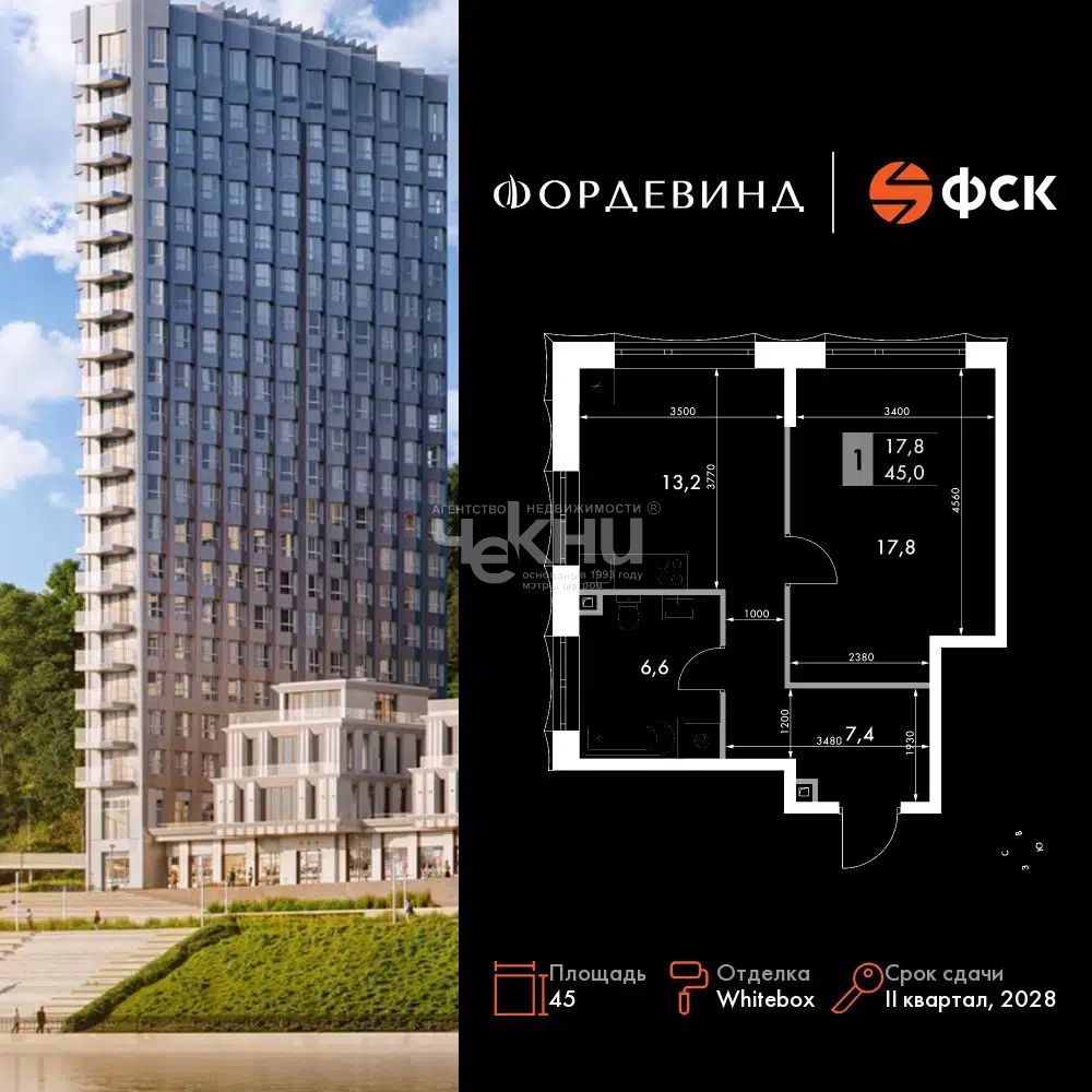 Площадь: 45/17.8/13.2 м²