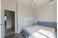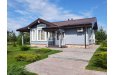 План дома: просторная кухня-гостиная с выходом на террасу, 2 спальни, уборная, гардеробная. На участке выполнен ландшафтный дизайн, по периментру - металлическая ограда. Зона барбекю и парковочная зона выложены брусчаткой.